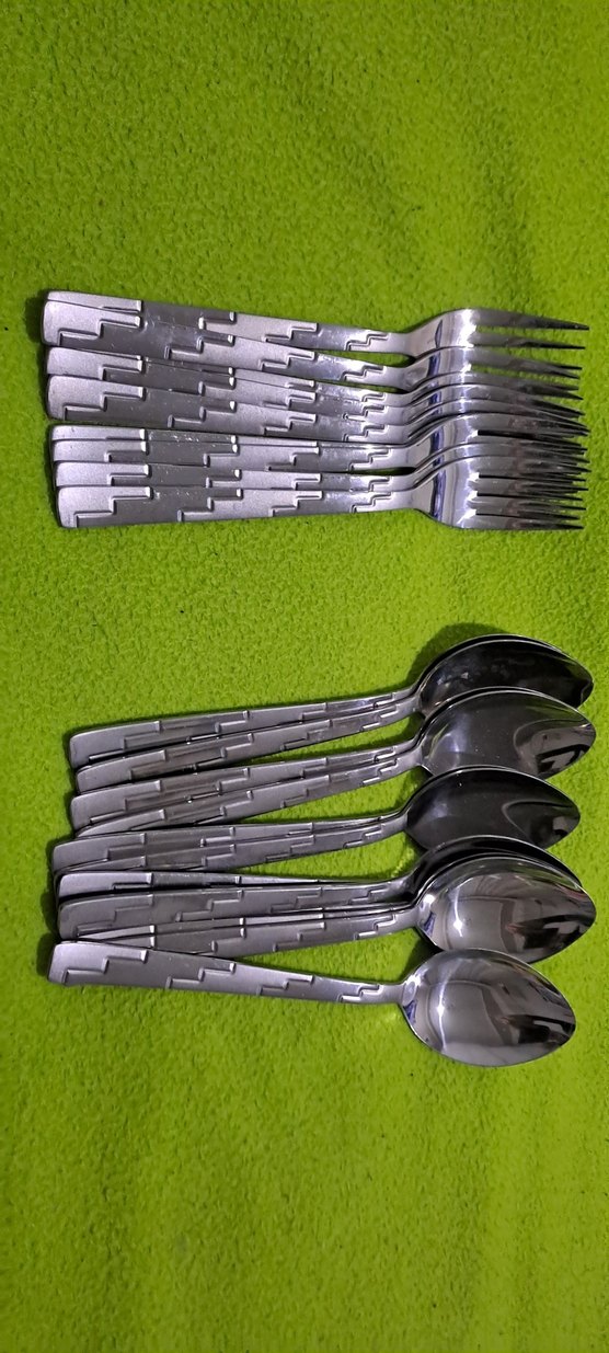 Gri desenli saplara sahip paslanmaz çelik çatal ve kaşık seti, yeşil zeminde yer alıyor. 12 adet catal 12 adet kasik 6 adet tatli çatalı 30 adet tamami aldim diyene net