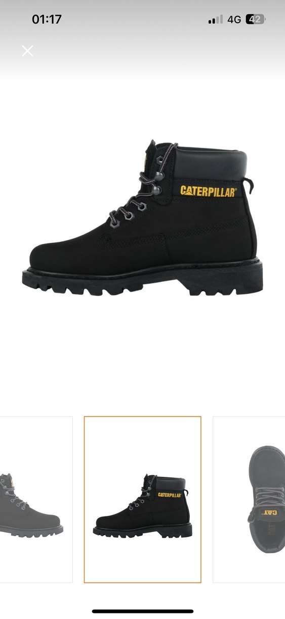 Platform topuklu, kemerli siyah kauçuk kadın botları. CATERPILLAR logosu bulunur. Ofis ve günlük sokak tarzı için uygundur.