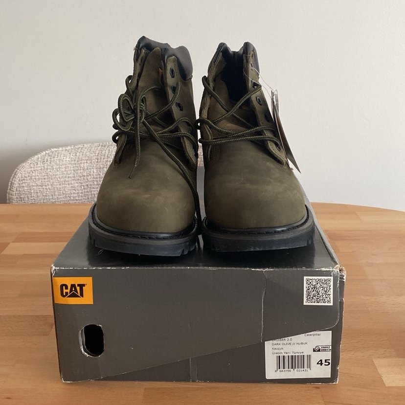 CAT markalı, haki nubuk malzemeden yapılmış, dolgu topuklu ve kemer detaylı erkek botlarıdır. Günlük sokak stiline uygundur.