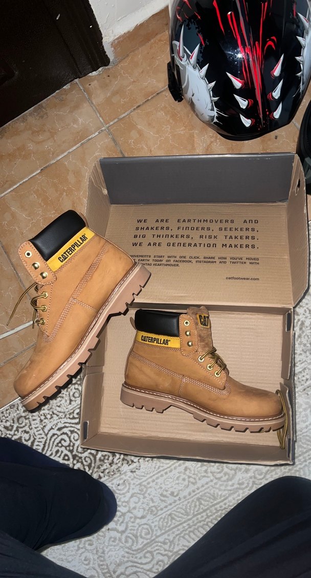 Caterpillar markalı kahverengi deri botlar, desen içermeyen koyu renkte sokak stili sunar. Günlük kullanıma uygun, rahat ve şık bir tasarıma sahiptir.