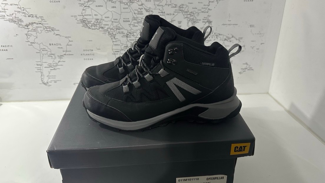 Caterpillar marka siyah ve gri renkte, bağcıklı, dayanıklı kauçuk malzemeden yapılmış erkek botu. Outdoor ve sokak stili için uygundur.
