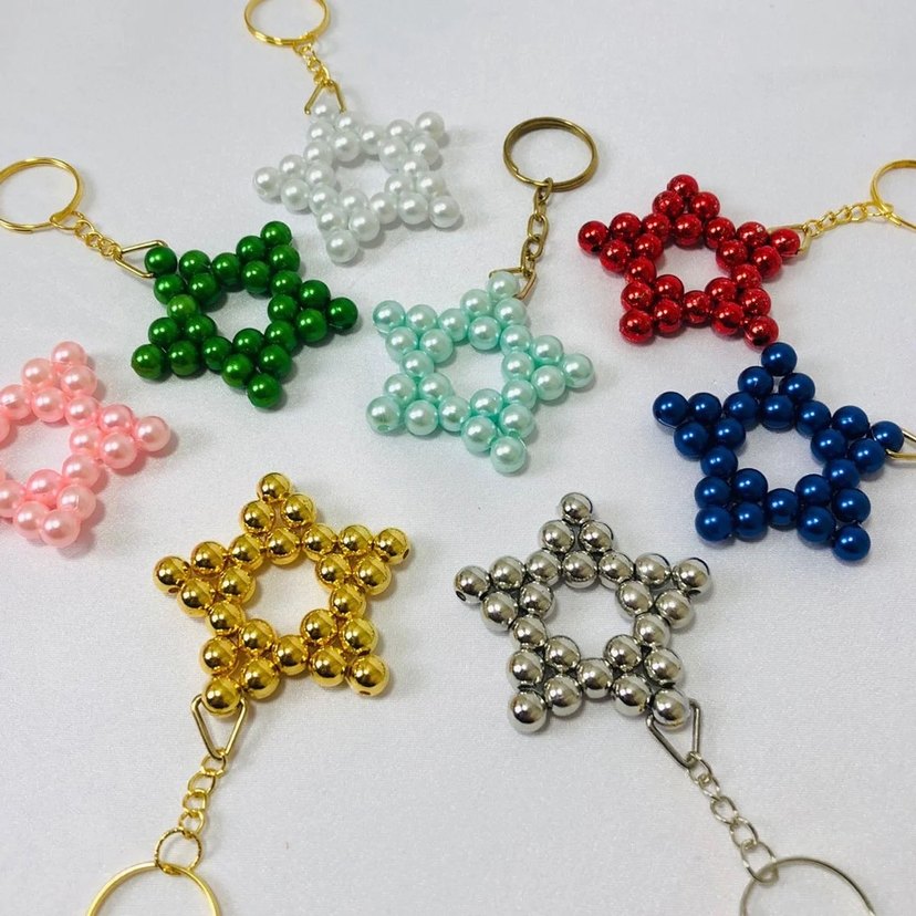 Yeşil, beyaz, kırmızı, mavi, altın ve gümüş renklerde boncuklarla yapılmış renkli yıldız şeklinde anahtarlıklar. Her biri metal halka ve zincir içerir.