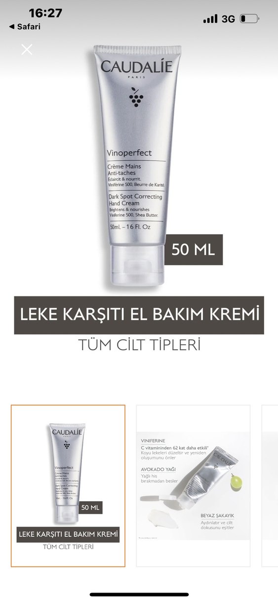 Caudalie Vinoperfect el kremi, Viniferine 500 ve shea yağı ile leke karşıtı etki sağlar ve cildi besler. Tüm cilt tipleri için uygundur.