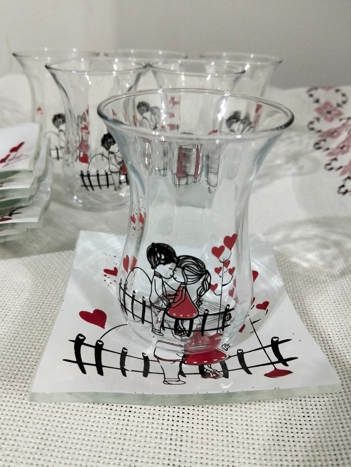 Romantik çift ve kalp desenli cam çay bardakları, kare tabaklarla set halinde sunulur. Çay keyfi için uygundur. karemıka markasıdır 2 takım bu sekulde vardır fıyatı bır takım ıcın gecerlıdır