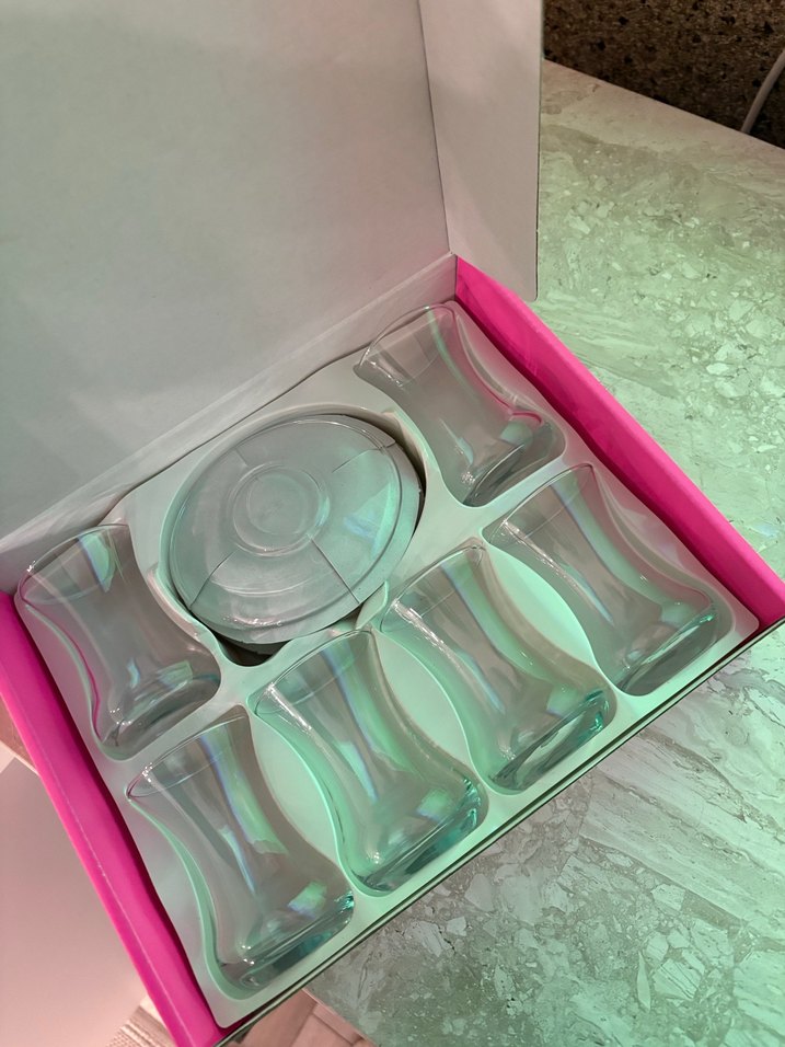 Altı adet cam çay bardağı ve kapaklı bir parça, pembe kutuda sunulmuştur. Bardaklar geleneksel çay bardağı tasarımına sahiptir.