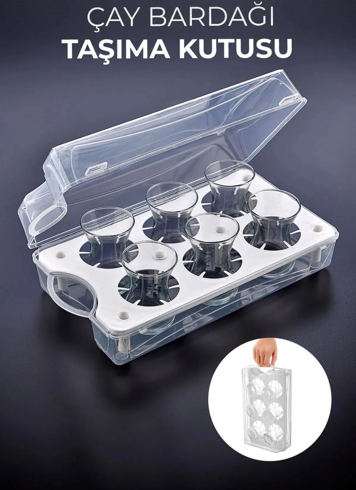 Beyaz taşıma kutusunda 6 adet çay bardağı güvenle yer alır. Şeffaf kapaklı ve taşıma saplıdır.