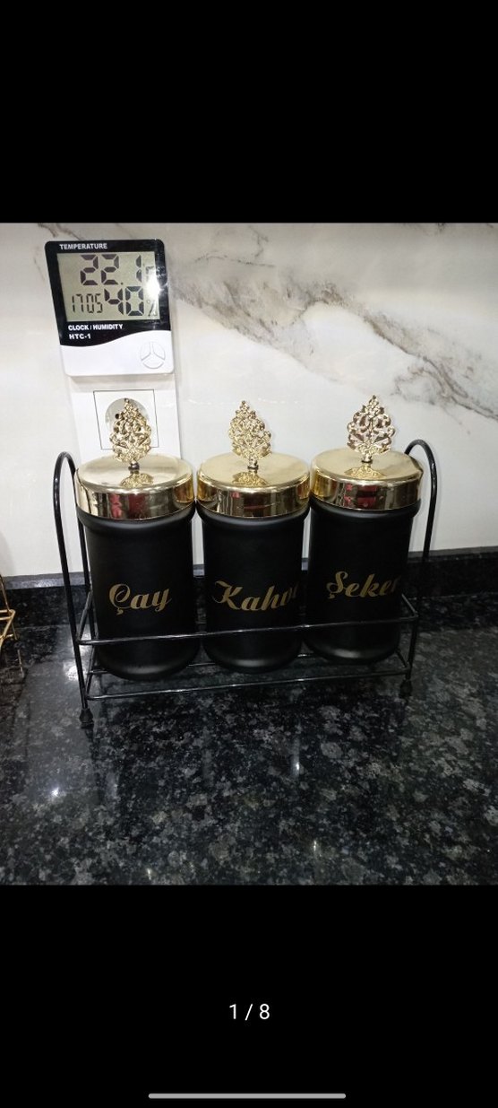 Kapakları gold detaylı çay, kahve, şeker kavanozları 3 tanesi takımdı az kullanıldı mutfağa uymadığı için satıyorum. Hepsi camdır tertemiz mutfağınızda çok şık durur. Hiçbir sorunları yoktur. Boy:16 cm