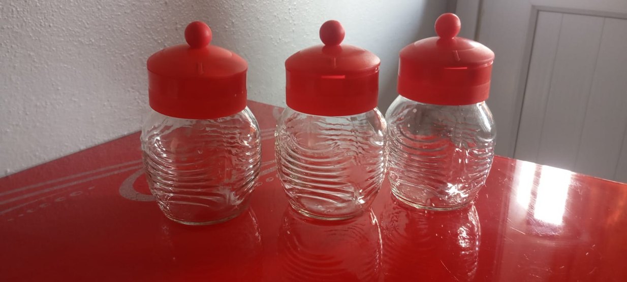 Kırmızı renkli kapaklı, temiz camdan yapılmış . Kolay kullanımlı ve temizlenebilir. çok az kullanıldı