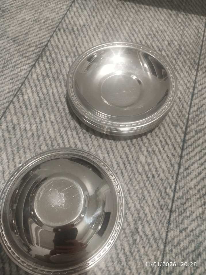 İki adet gri parlak metal küçük kase, sade tasarımlı, servis veya masa kullanımı için uygun.