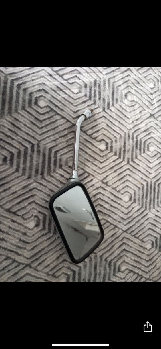 Metal kol ve siyah çerçeveli gri dikdörtgen motosiklet aynası, arka görüş için tasarlanmıştır.