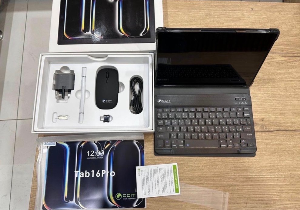 Klavye, stylus ve mouse içeren siyah CCIT Tab16Pro tablet.. Aksesuarlar ve kullanım kılavuzu ile birlikte. SIFIR KAPALI KUTU