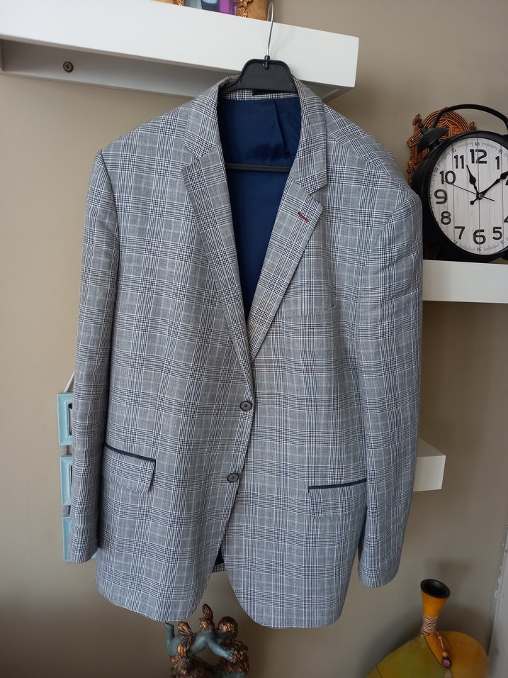 Gri renkte, düğmeli erkek ceket. Notch yaka, regular fit, uzun kollu ve midi boy Ofis ve gündelik sokak tarzına uygundur. kuru temizleme yapılmadı Ceplerde koyu detaylar vardır.