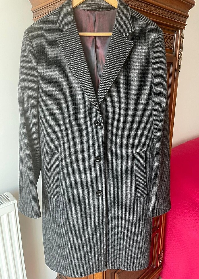 CCS Sarar Yün Palto Kaban. Bir iki defa kullanıldı. Dolapta durduğundan tuylenme oluşmuş. İki koltuk arası düğmeler kapalı, En; 55 cm. Kol altından aşağı uzunluk 75 cm, omuzdan tam boy ölçüsü değildir. Etiketleri kesildiği için tahmini ölçülere göre beden girildi. 48 / 50 / 52 Beden olabilir. #sarar #palto #kaban #mont
