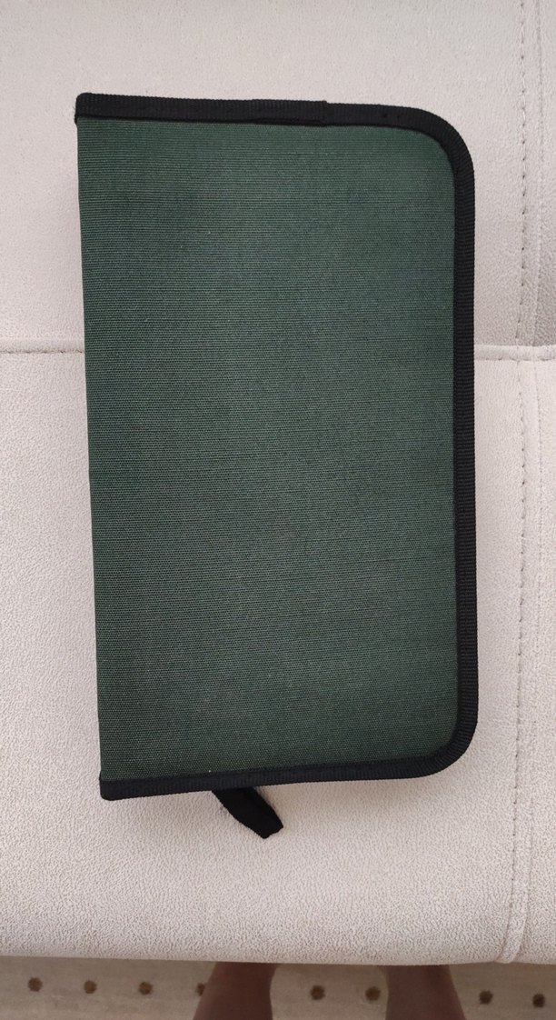 Koyu haki renkte, siyah kenarlıklı, desensiz, fermuarlı, CD/DVD organizer çanta.