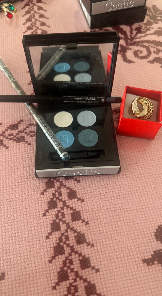 Mavi ve gri tonlarında dört göz farı kaliteli kalıcı , doğal colour trend kalem deep turQuise , açılıp kapanabilen twilight sparkle kalem ve esmer sarı eskitilmiş renginde içine gömmeli yüzük