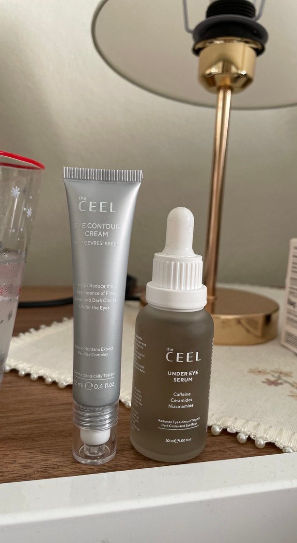 The CEEL göz bakım seti, şişkinlik ve koyu halkaları azaltmak için kafein ve niasinamid içeren göz çevresi kremi ve serum içerir. Serumu bir kez kullandım zaten dolu gördüğünüz gibi. Diğer soğutucu başlığı da 2 kez kullandım hassas bi göz çevrem var bana etki etmedi umarım size eder. İki ürün birlikte 250 tldir.