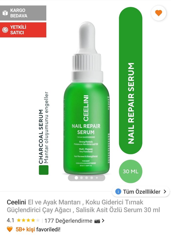 Ceelini 30 ml serum, çay ağacı ve salisilik asit içerir, tırnak mantarını ve kokusunu önlemeye yardımcı olur. Güçlendirici etkisi vardır.
