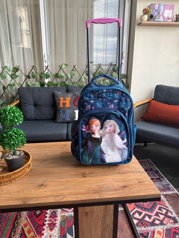 Koyu mavi çekçekli kız çocuk okul çantası, ön cephesinde animasyon karakterleri bulunur. Kolay taşınabilir yapıya sahiptir.