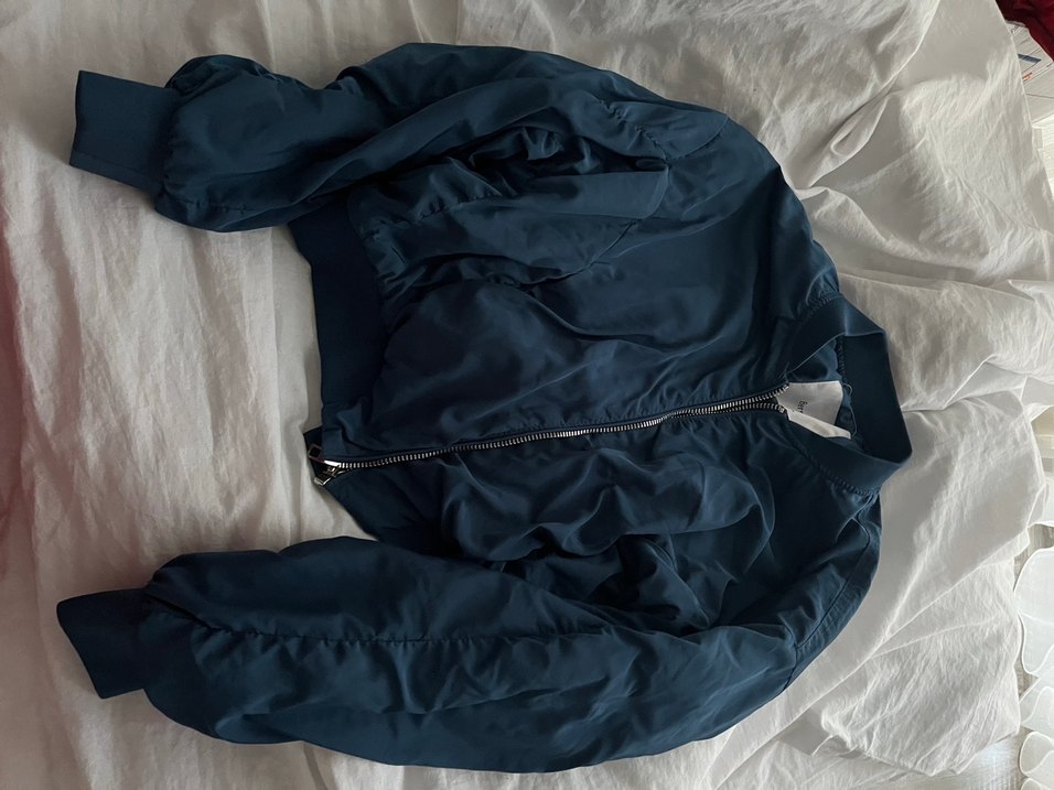 Fermuarlı, yüksek yakalı ve keten kumaştan yapılmış, normal midi boyda, koyu mavi renkli kadın ceketi. Günlük sokak stili için uygundur. cok az giyildi