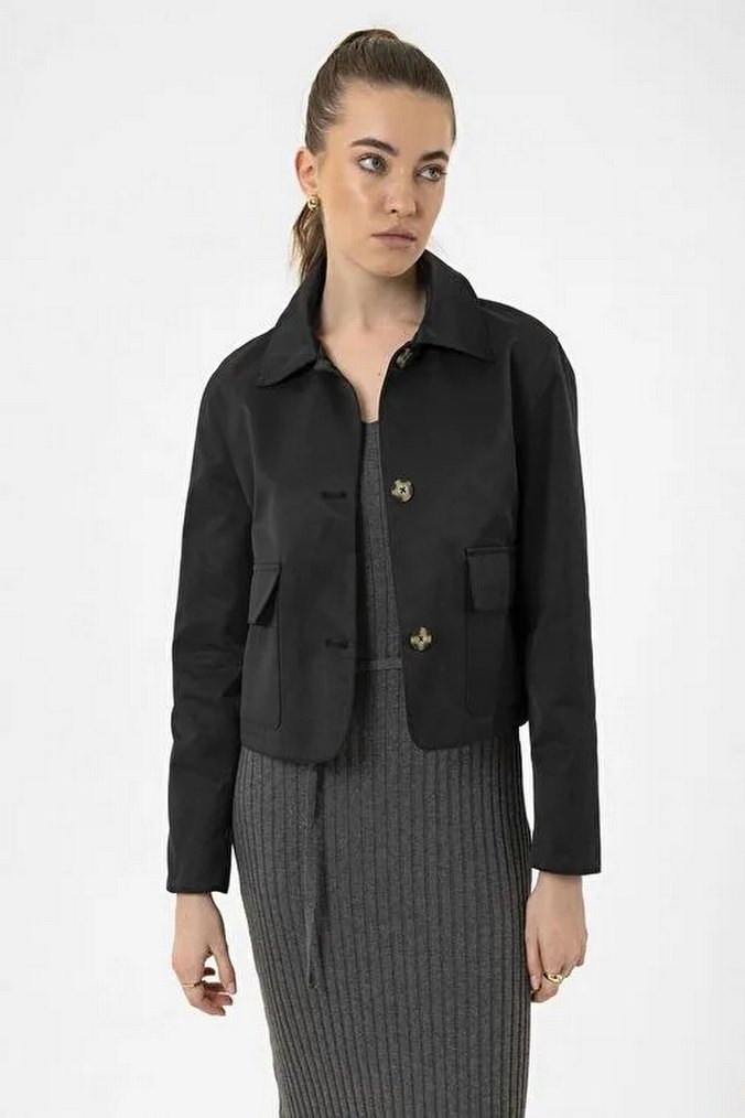 Siyah renkli mini uzunlukta düğmeli bu kadın ceketi sentetik kumaştan yapılmış,uzun kollu günlük ve ofis kullanımına uygundur. 38/S Beden Ürünün giyilmiş andırıyor halindeki görseli yükledim