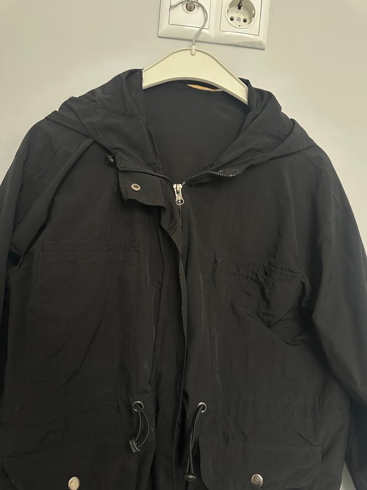Siyah keten ceket, kapüşonlu ve fermuarlı. Yağmurluk tarzında yepyeni 2 defa giyildi . M ve L beden uyumludur.