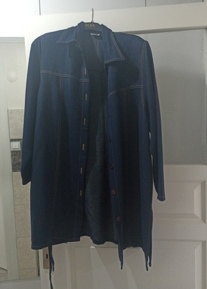 Lacivert kot görünümlü ceket 1 ya da 2 belki giyilmiştir taş gibi hiçbir sorunu yok yüzde yüz pamuk