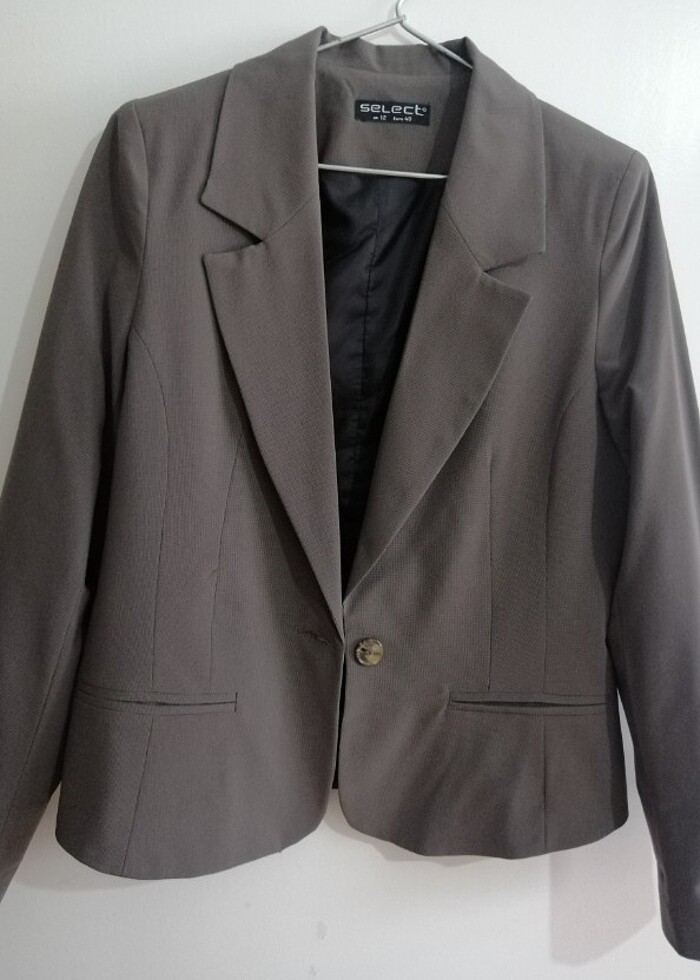 Minik kareli. Rengi kahverengi-haki yeşil gibi. Astarlı. Arkası yırtmaçlı. Önü düğmeli. İnce vatkalı. Mevsimlik. Etiket bedeni 40 ama kalıp dar. 36-S/38-M bedenler için uygun. Boy 59cm, iki kol altı arası 47cm
