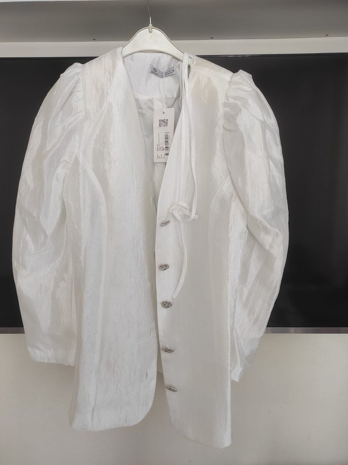 urun hediye geldi üzerime olmadığı için satıyorum parlak saten kumastır hiç kullanılmamıştır 42 bedendir etiketi üzerindedir iade kabul edilmemektedir alanlara simdiden hayırlı olsun sayfamı ziyaret etmeyi unutmayın Düğmeli, saten kumaştan beyaz mini gömlek. Notlu yaka ve uzun balon kollu, regular kesimdir. Ofis ve sokak stiline uygundur. ✨