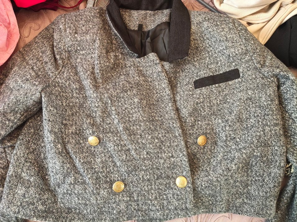 Gri yün kaban, düğmeli ön ve kesik yaka ile birlikte gelir. Normal kesim, uzun kollu ve midi boyda, desen içermeyen bir sokak stili parçasıdır.
