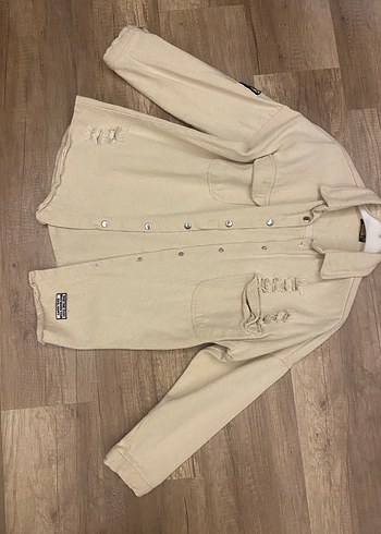 Uzun kollu, düğmeli, bol kesim bej keten ceket. Yaka detaylı, yıpranmış görünümüyle günlük sokak tarzına uygun. S M L giyebilir