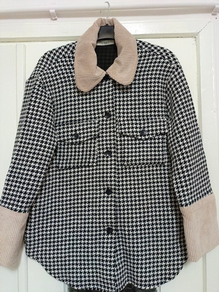kazayağı desenli uzun kollu bol kesim 36-38 bedene uyumludur. hiç giyilmemiştir.