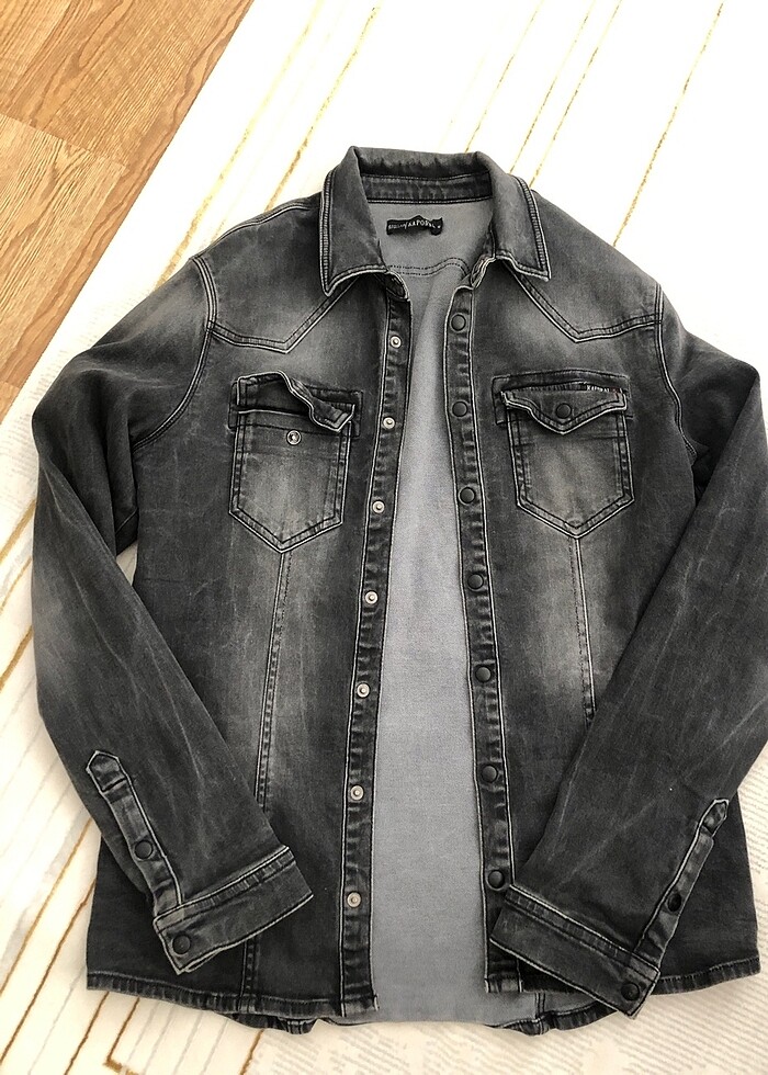 Sadece ön cebinin düğmesi yoktur. Kot ceket gömlek