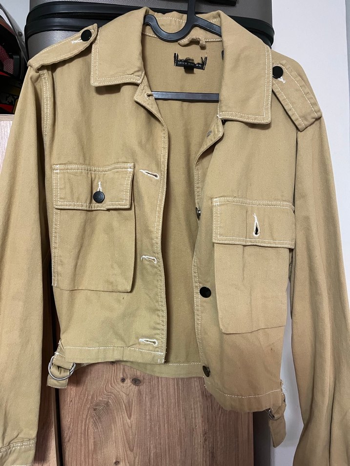 Bej süet kadın ceketi, düğmeli, uzun kollu ve kesik yaka detaylıdır. Rahat kesimi, cep kapakları bulunuyor herhangi bir deformesi yoktur