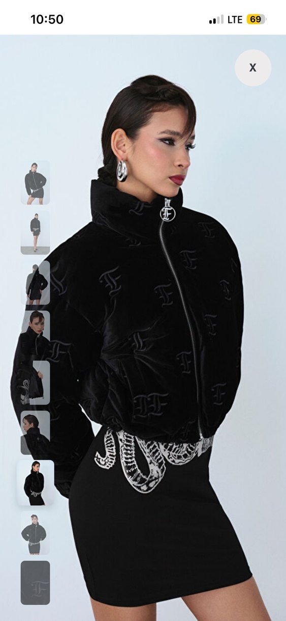 Siyah, yüksek yakalı ve uzun kollu bu fitted ceket, yumuşak ve sıcak kumaş üzerinde baskılı desen ve kürk detaylarına sahiptir.