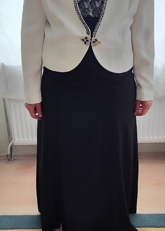 ürün bir kez giyilmiş ceketli takımdır herhangi bir sıkıntısı yoktur. elbisesi kalın askılı koldur kollarına yarım tül eklenmiştir orjinal gibidir.
