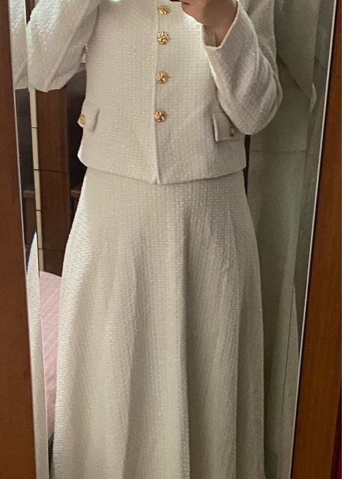 hiç kullanılmamış krem rengi etekli takım