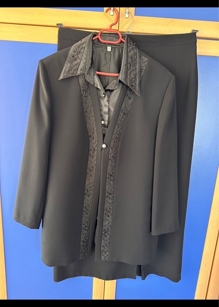 Ürün üç parçadan oluşmaktadır. Ceket, gömlek ve etek. Ceket ve etek 48, gömlek 50 bedendir ama gömleğin bedeni dardır. 46-48 bedenlere uyum sağlar. Ceket ve etek kumaşı çok kaliteli bir kumaşa sahiptir. Gömlek saten, düğmeleri taş, yakası da işlemelidir.
