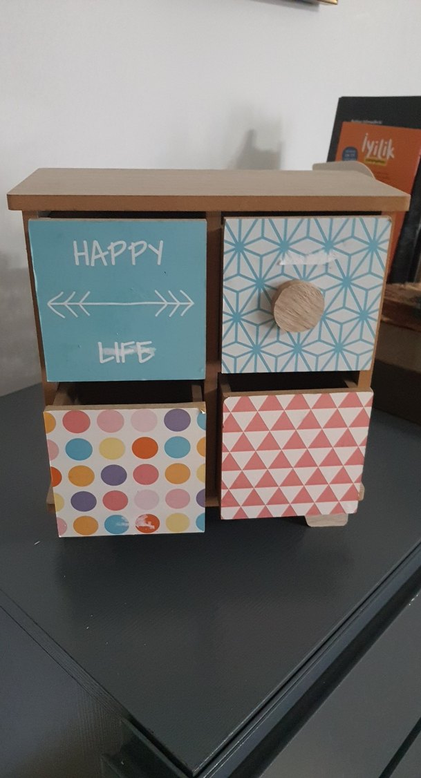 #çekmeceli #ahşap #kutu, tek bölmesini kulpu var, başka kulp yapıştırılabilir, üzerinde etiket izleri var, fotoğrafta göründüğü gibi
