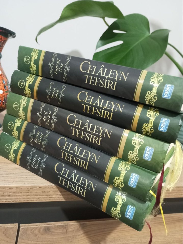 Celaleyn Tefsiri, detaylı açıklamalar içeren 5 ciltlik dini kitap setidir. Her cilt sert kapaklı ve altın-yeşil detaylara sahiptir.