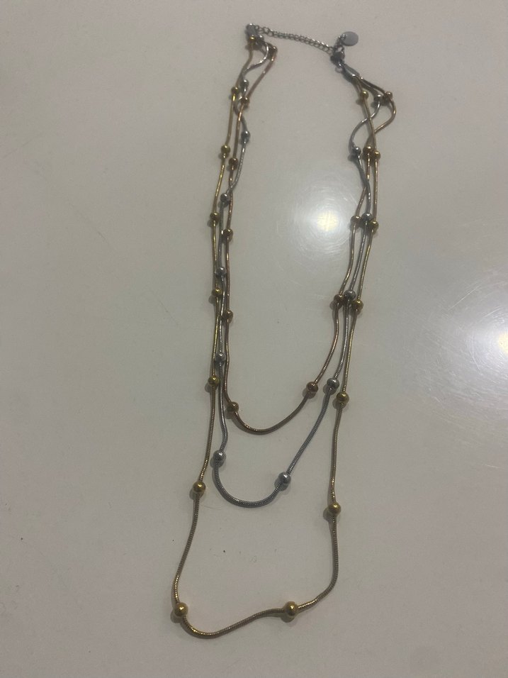 Uzun, altın ve gri ve renkli zincir detaylı kolye, bohem ve minimalist tarzda bileklik 3 sıra şeklinde biraz kullanılmış iade yoktur takımdır fiyata yansımıştır , günlük kullanıma uygundur. Takım fiyatıdır
