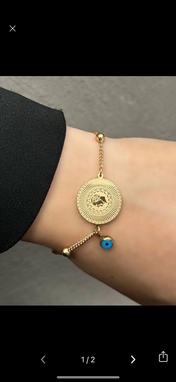 Altın renginde, işlemeli desenli ve zincir detaylı bohem tarzı bileklik. Küçük mavi nazar boncuğu ile günlük kullanıma uygun.