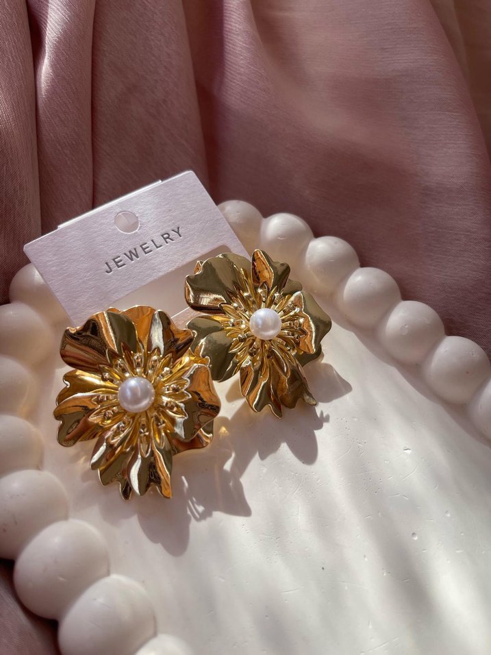 Parlak altın renkli, mini uzunlukta, çiçek deseni ve inci detaylı küpeler, modern klasik tarzda ve düğünler için uygun.