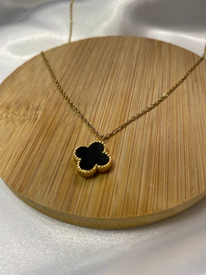 Altın renkli uzun kolye, zincir detaylı ve koyu renkli nakışlı yonca şeklinde ucu ile minimalist, klasik zarafet sunar. Günlük kullanıma uygundur.