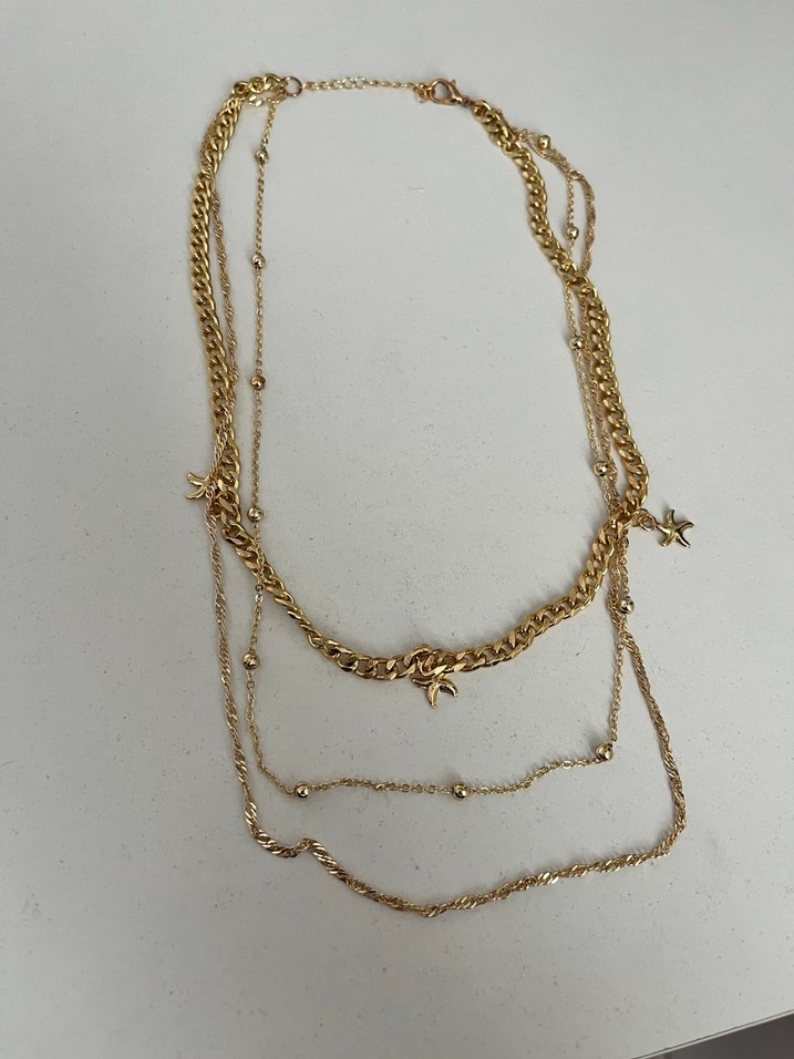 Altın renkli, zincir detaylı kadın kolye. Küçük yıldız süslemeleri ve parlak yüzeyiyle günlük kullanıma uygun, normal midi uzunlukta, minimal bohem tarzda. ✨