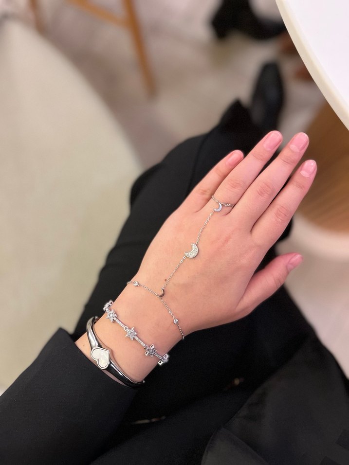 Gümüş tonlu, zarif zincir detayları ve hilal figürlü bohem tarzda günlük kullanıma uygun kadın el zinciri.