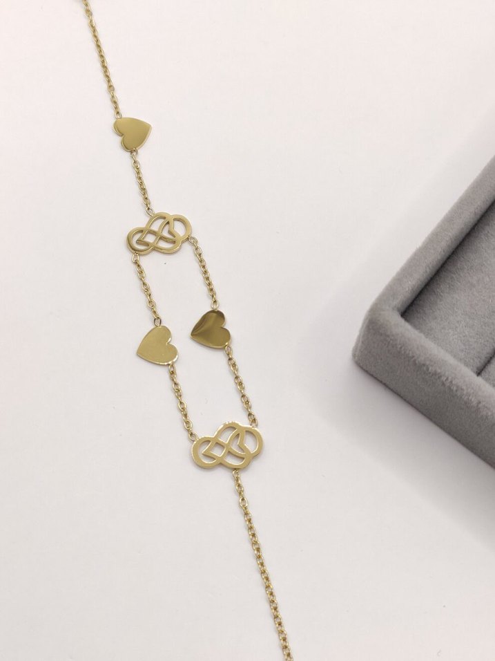 Uzun uzunlukta, detaylı zincir ve kalp ile karmaşık düğüm motifleri bulunan günlük kullanıma uygun minimal ve bohem tarzda.
