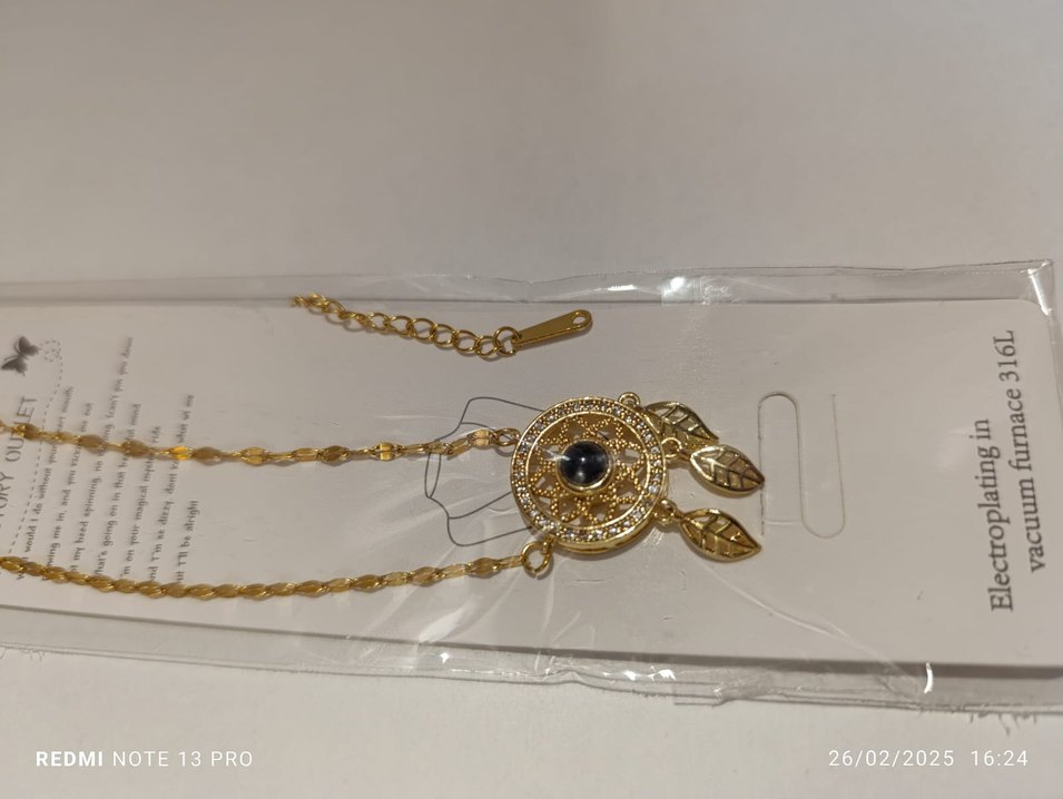 Bohem tarzda, zincir detaylı ve baskılı tasarıma sahip altın renkli kadın el zinciri, günlük kullanıma uygundur.