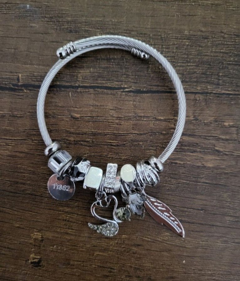 çelik bohem tarzda, kuğu ve tüy figürlü çeşitli boncuk ve süslemelerle tasarlanmış, yılan desenli kadın bilekliği. Günlük kullanım için uygundur.