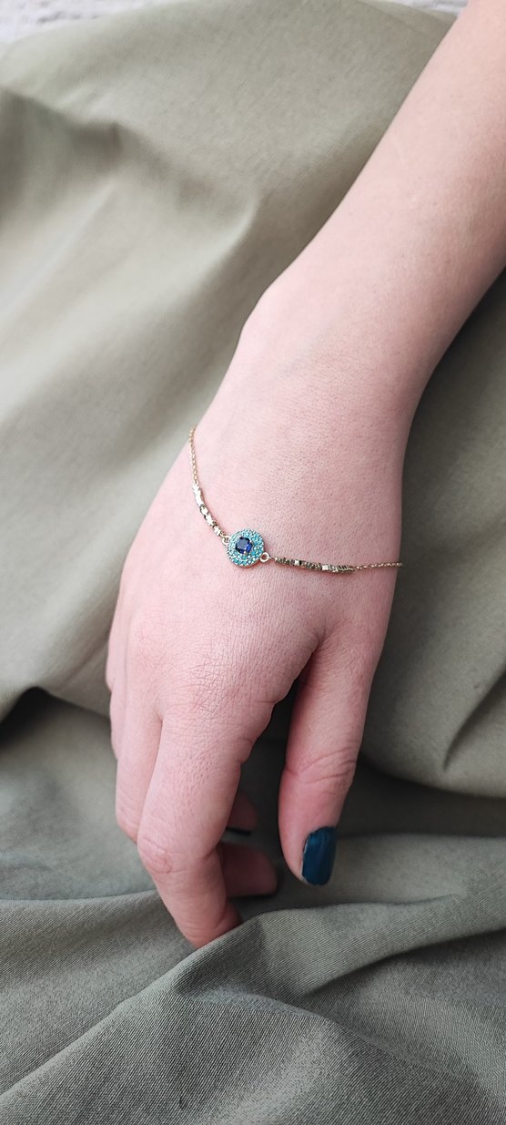 Minimalist bohem tarzda, işlemeli turkuaz boncuklarla süslenmiş ince zincir bileklik, günlük kullanıma uygun.