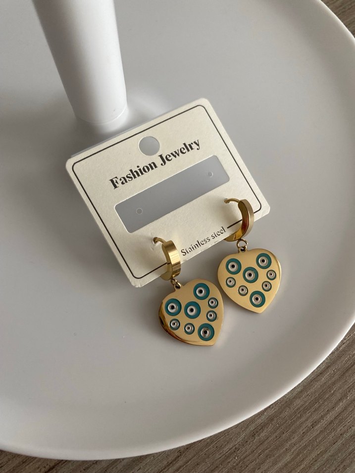 Altın renkli kısa halka küpeler, boncuk desenli kalp şeklinde baskılı mini sarkıtlar, paslanmaz çelikten yapılmıştır.